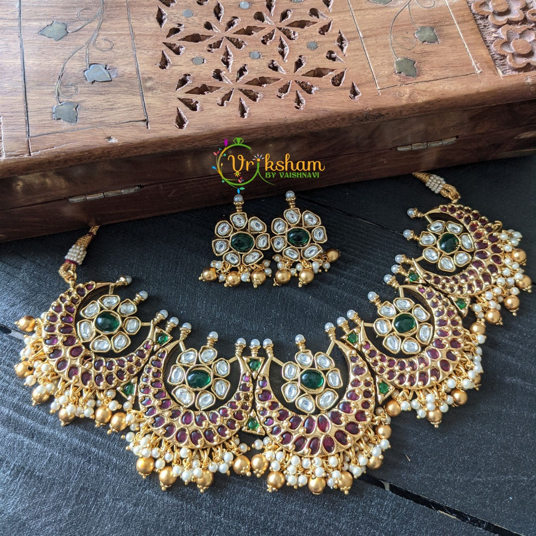 AD Stone Chandbali High Neck Choker – Red and White half moon style choker with centre green stone, comes with matching earrings. Cluster Pearl Finish.