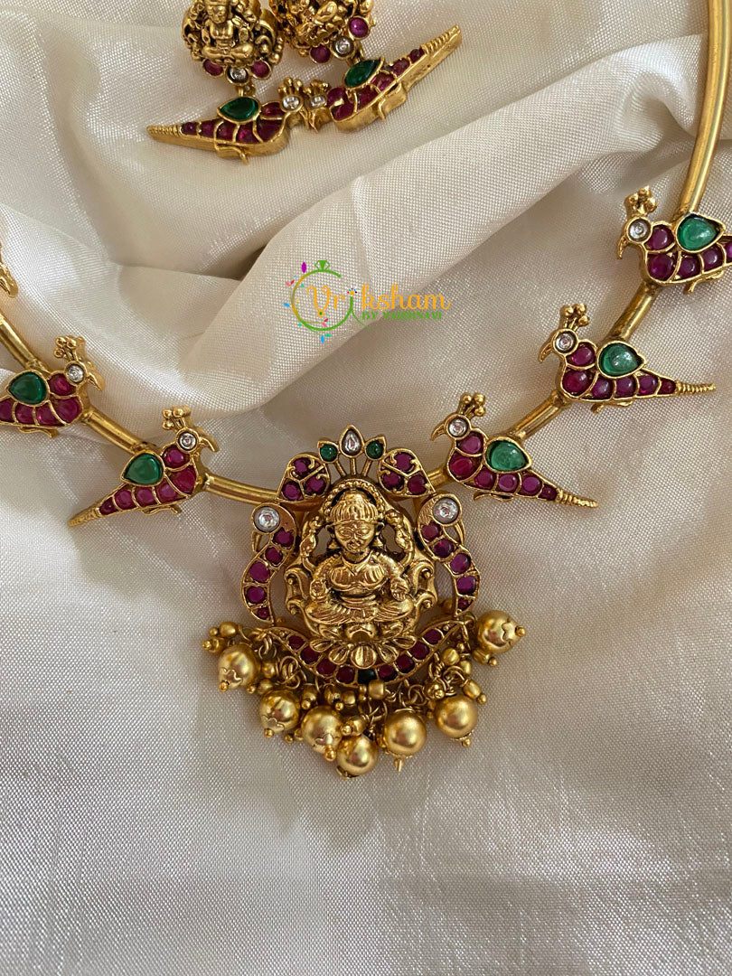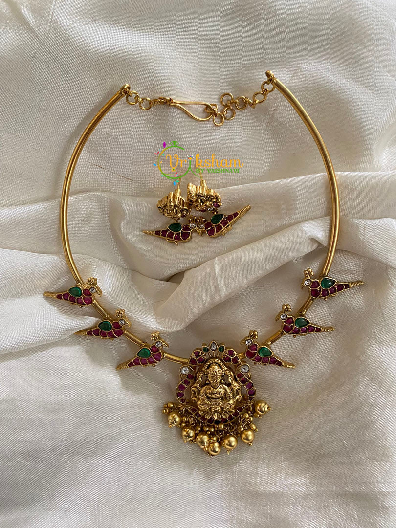 Premium AD Stone Lakshmi Hasli Choker-Parrot-Gold Bead finish parrot side pendants premium quality AD Stone studded pendant hasli short neckpiece, comes with matching earrings.