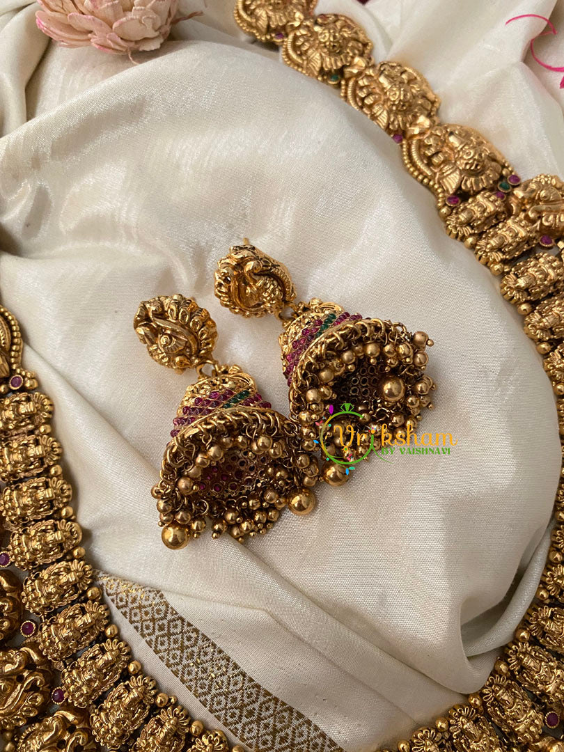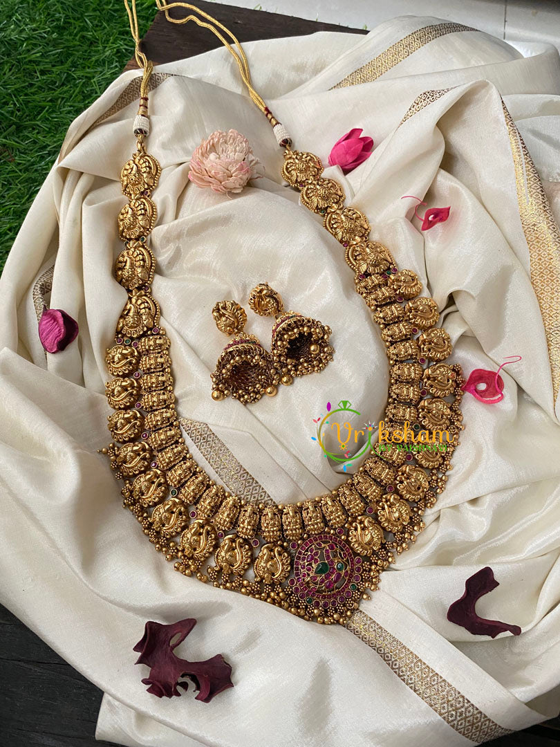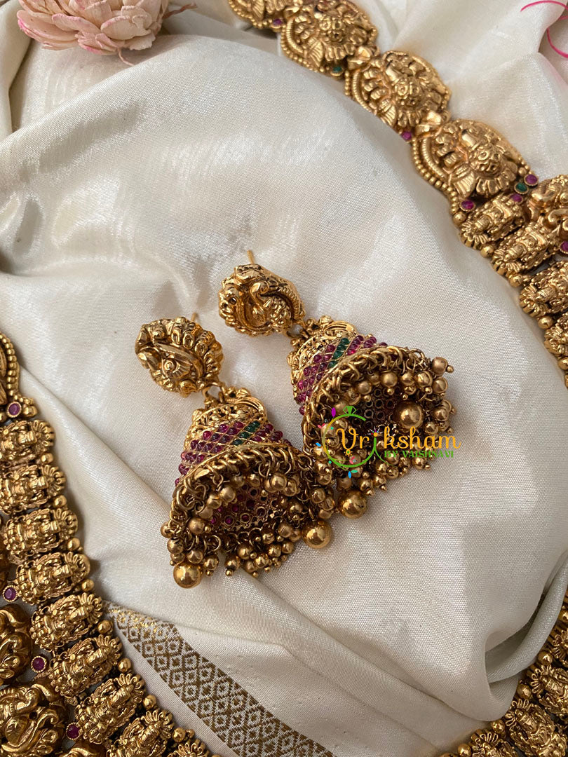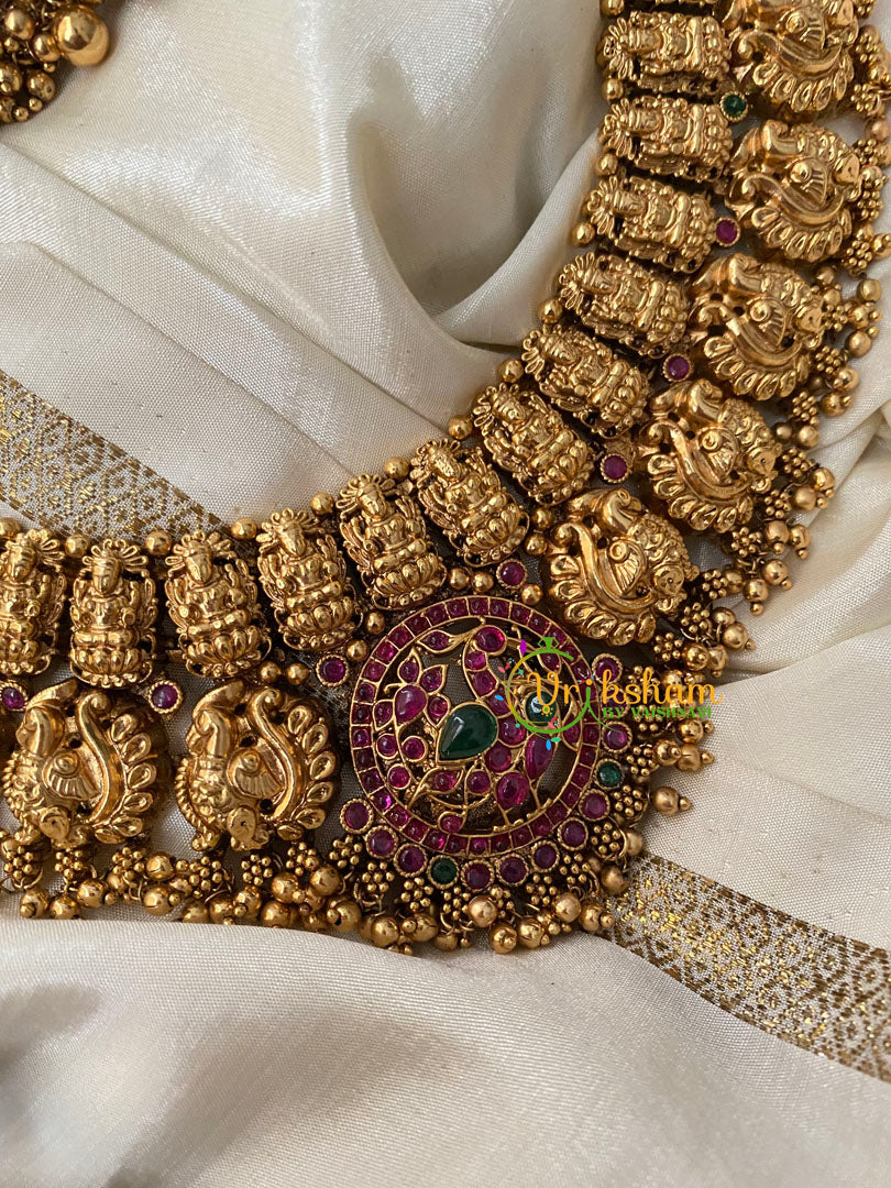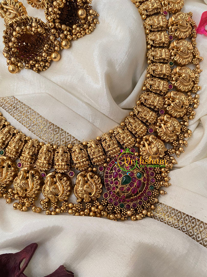 Premium Antique Temple Haram -AD Stone Layer Lakshmi haram-Intricately Designed Temple Neckpiece ad stone peacock centre pendant layer of lakshmi and another layer of peacocks; comes with matching ear jhumkas.