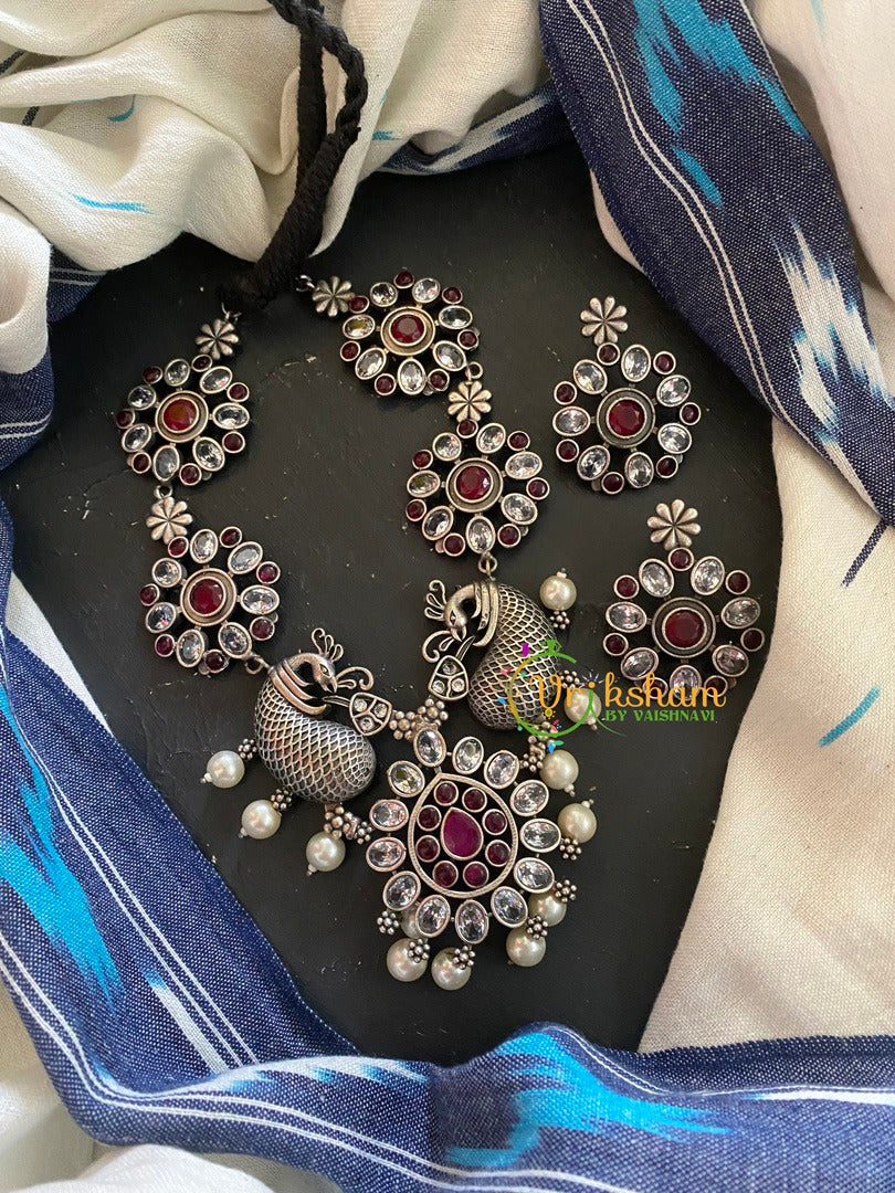 Red White AD Stone Peacock Neckpiece- Tilak shape stone studded pendant with pearl finish–neckpiece; comes with matching earring.