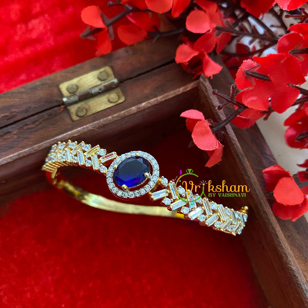 Gold Tone American Diamond Bracelet-Blue oval centre stone- criss cross white stone pattern-white stone Gold Tone .