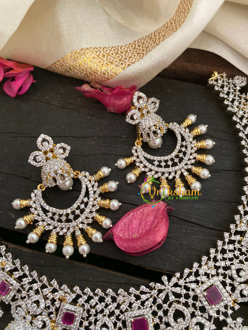 American Diamond Choker Neckpiece-Pink–Gold TONE imitation jewelry set; Comes with a pair of similar danglers. Pearl Finish Neckpiece.
