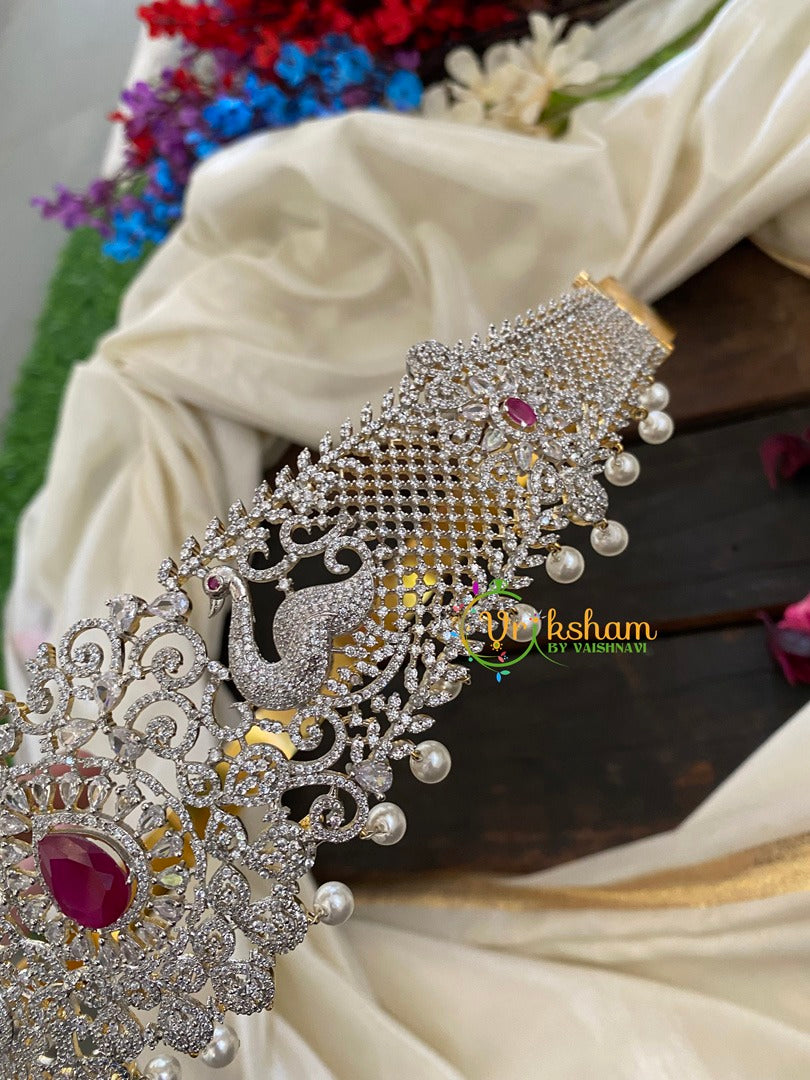 American Diamond Hipbelt -Centre Red Pink Tilak shaped stone complete white American diamond hipbelt with pearl and centre Jhumka Finish.