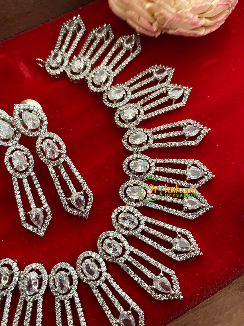 White Tone American Diamond Neckpiece- Boho–WHITE TONE imitation jewelry set; Comes with a pair of similar danglers.