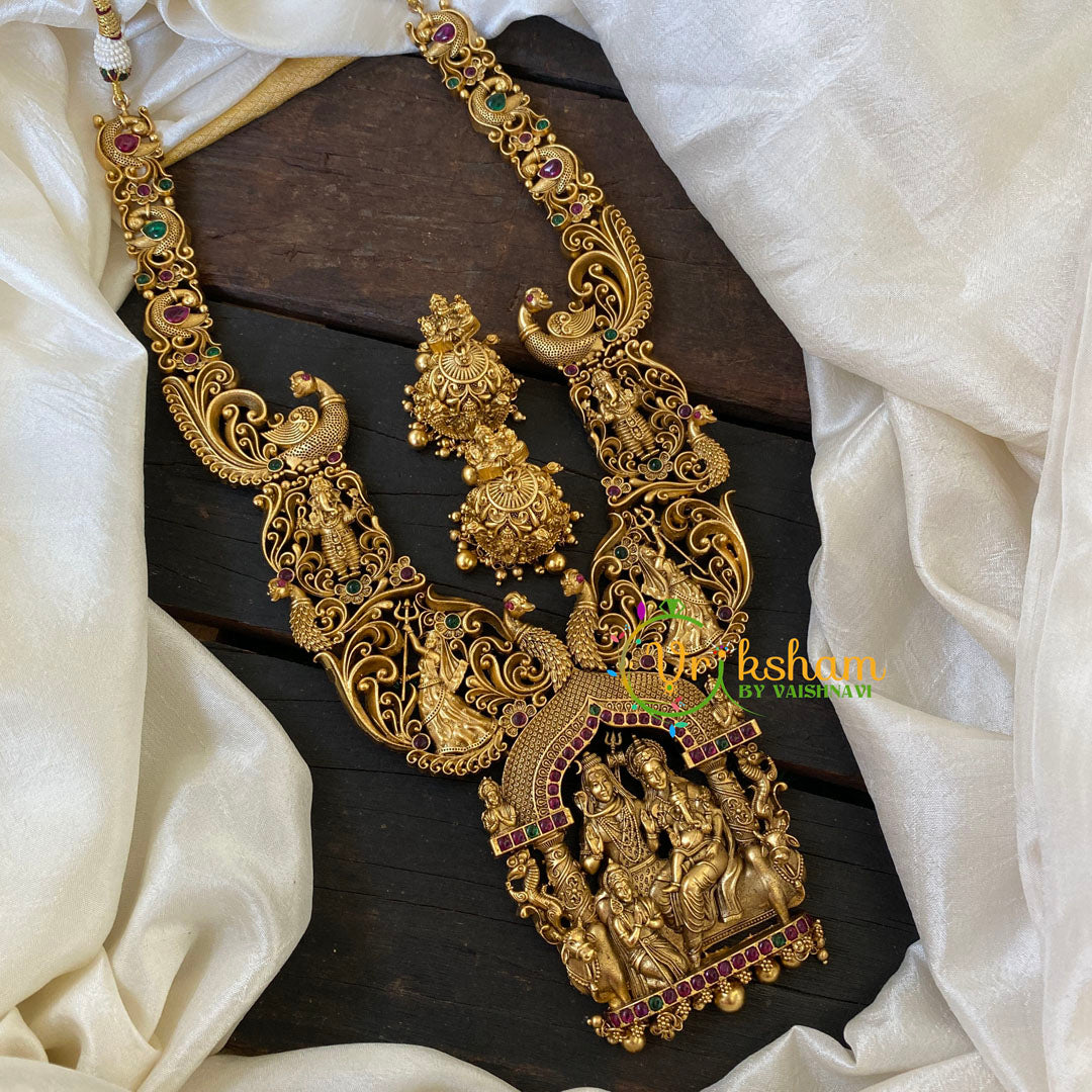 Antique Gold Temple Neckpiece- Shiva Parvathy Neckpiece- shivan parvathy and family pendant neckpiece– Antique gold polish - studded with semi-precious stones; comes with matching earrings.