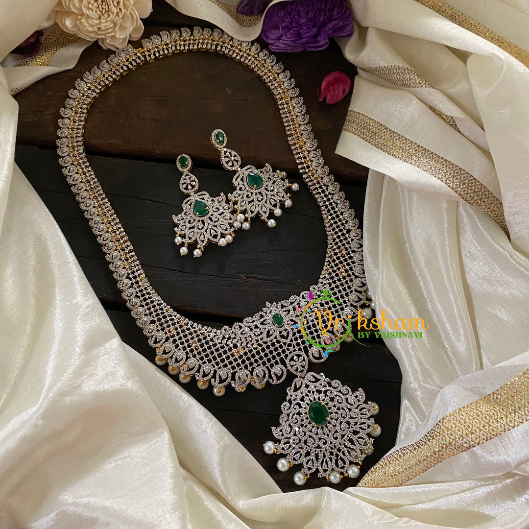 Bridal American Diamond Haram-Green-Bridal Neckpiece– with pearl finish; centre Green stone and matching jhumkas. Gold tone polish.