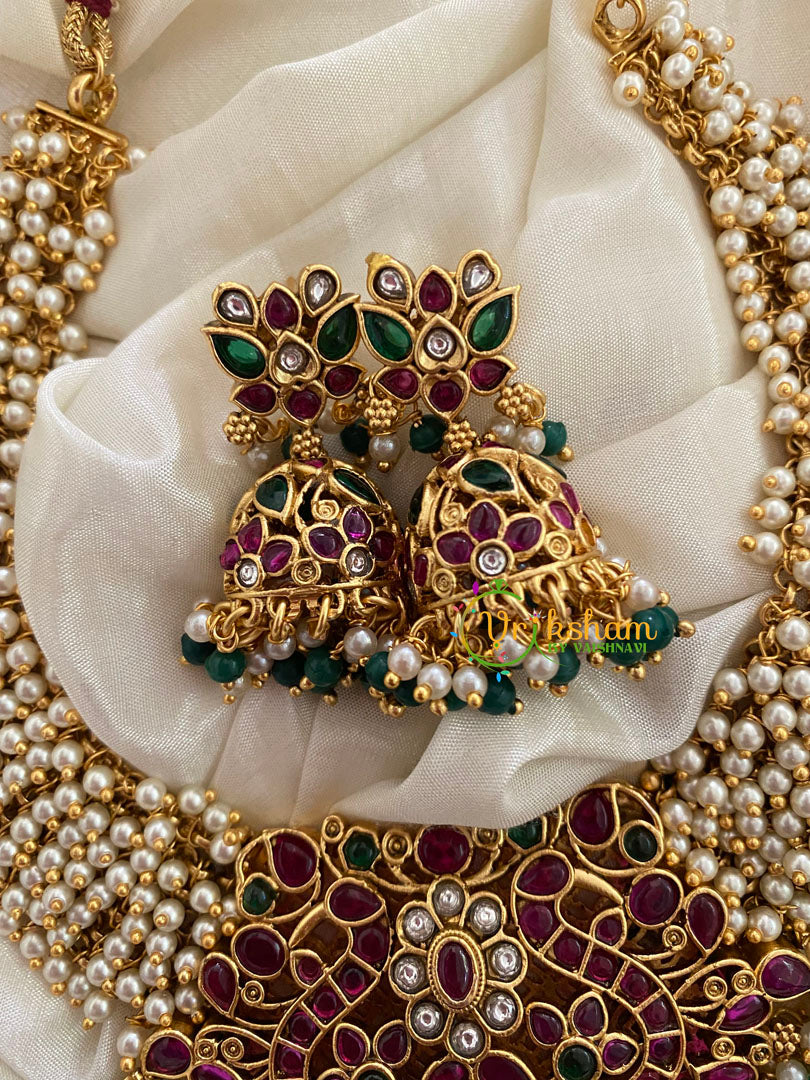 Gold Look alike Cluster Pearl Pendant Choker -cluster of pearls arranged in linear fashion with centre Kemp Pendant, comes with jhumkas.