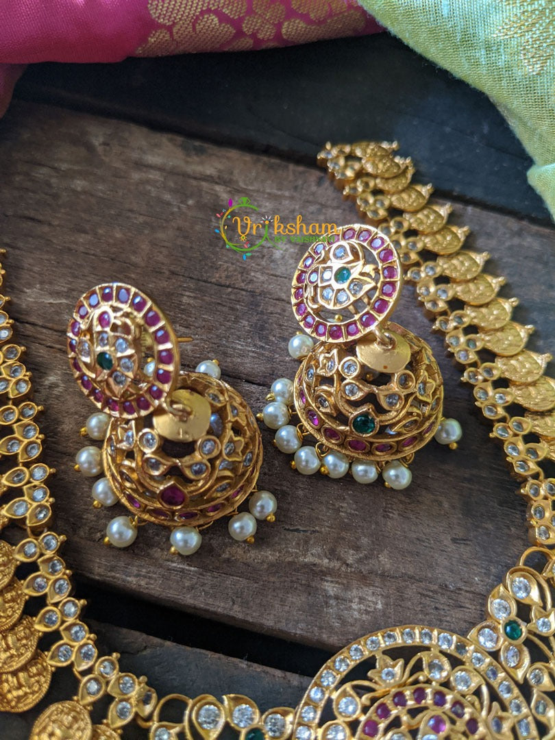 Coin Round Pendant Neckpiece is a Lightweight, Elegant and Premium Quality gold look alike neckpiece with earrings and back rope. This simple and elegant temple neckpiece can be worn as a choker or a little low as a beautiful neckpiece. Comes with a beautiful pair of matching jhumkas. The carvings are intricate and gorgeous on the choker and so are the pearl embellishments.
