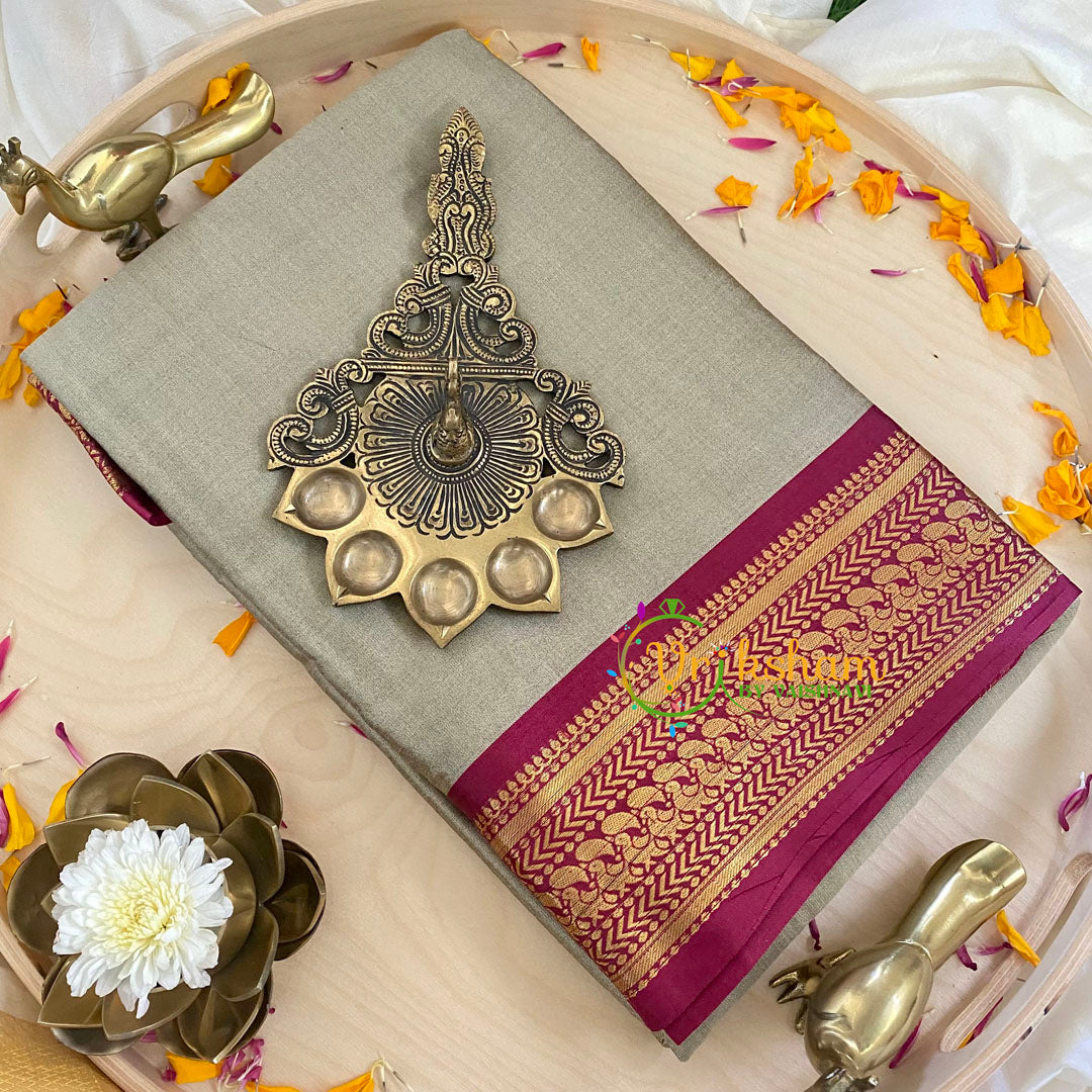 Grey with Red Litchi Silk Saree- Festive wear saree – Plain pattern body throughout the saree; comes with Blouse attached. Contrast border and pallu.