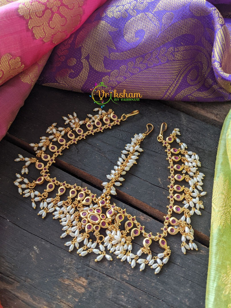 Guttapusalu Maang Tikka / Nethichuti - Maanga style with red stone studded two sided nethichuti/Maang Tikka with cluster pearl Guttapusalu (rice pearls) style finish.