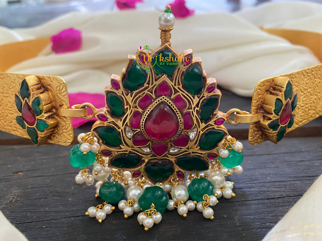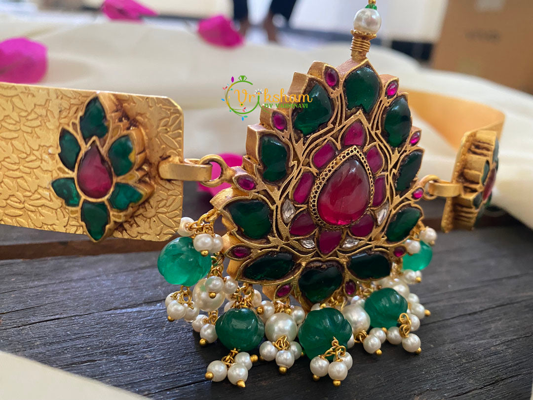 Precious Jadau Kundan Plain Hipbelt -Lotus- pearl and bead finish; embossed belt design.ADULT'S hipbelt.
