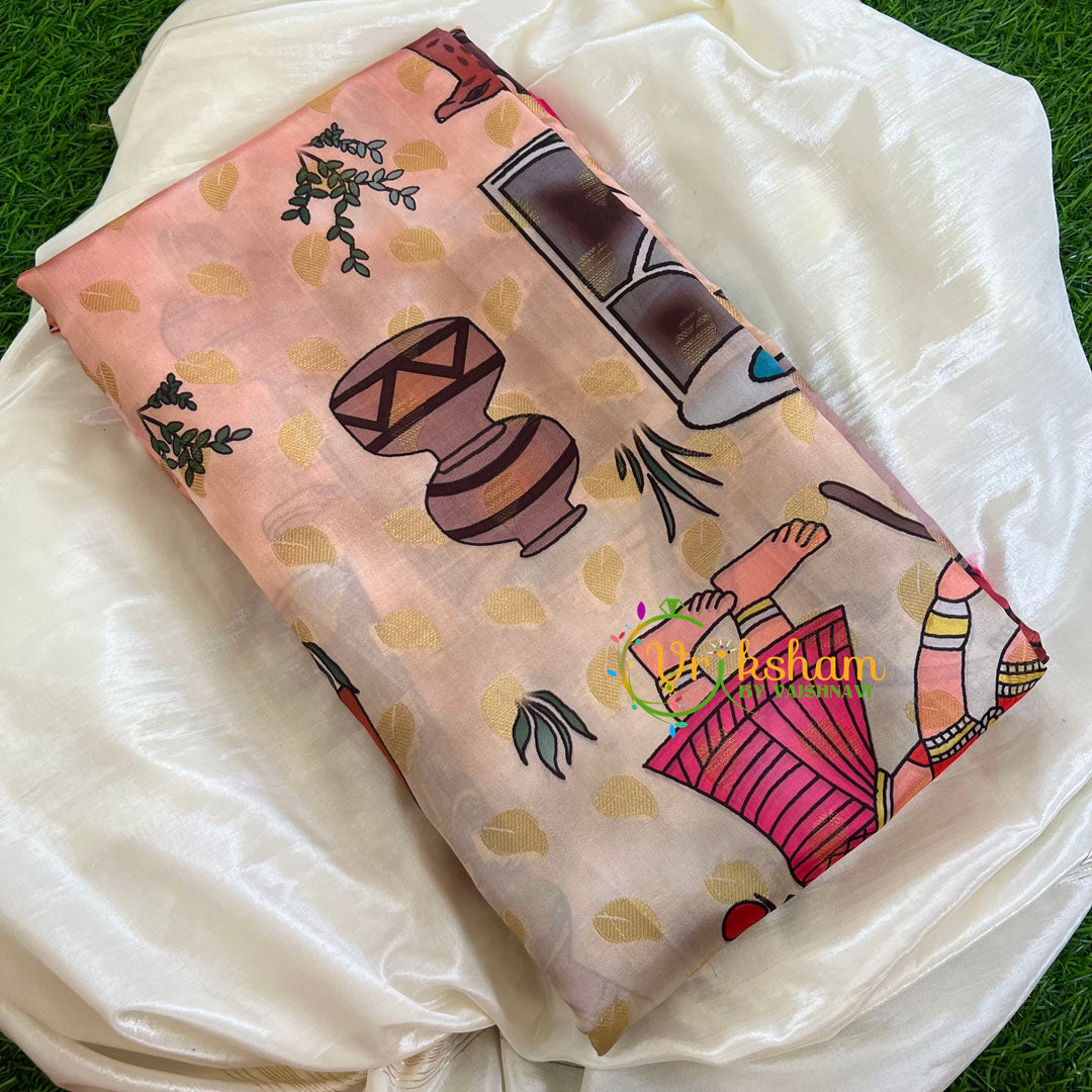 Half White with Pink Kalamkari Semi Soft Silk Saree – with traditional border – Kalamkari digital print pattern throughout the saree; comes with Blouse attached. Two side contrast traditional border and pallu.