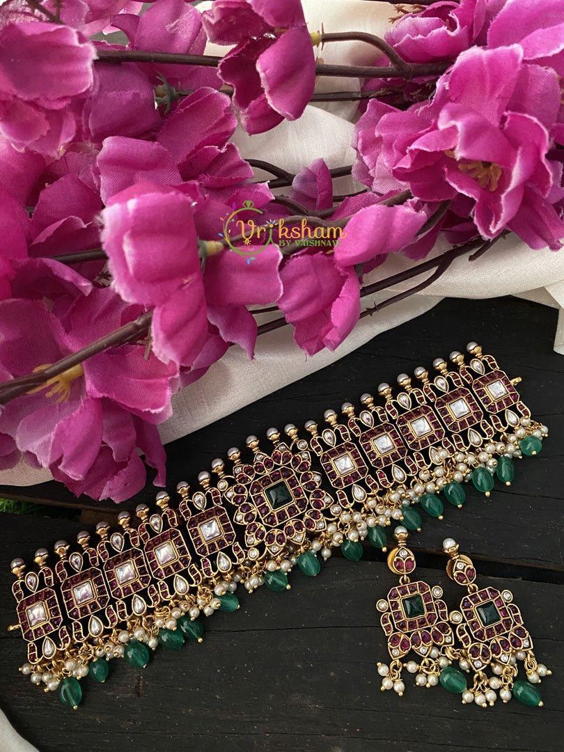 Premium Kemp and AD stone High Neck Choker -Red and Green (centre) kemp and white AD stone studded premium quality high neck choker; Green bead finish. Comes with matching ear hangings.