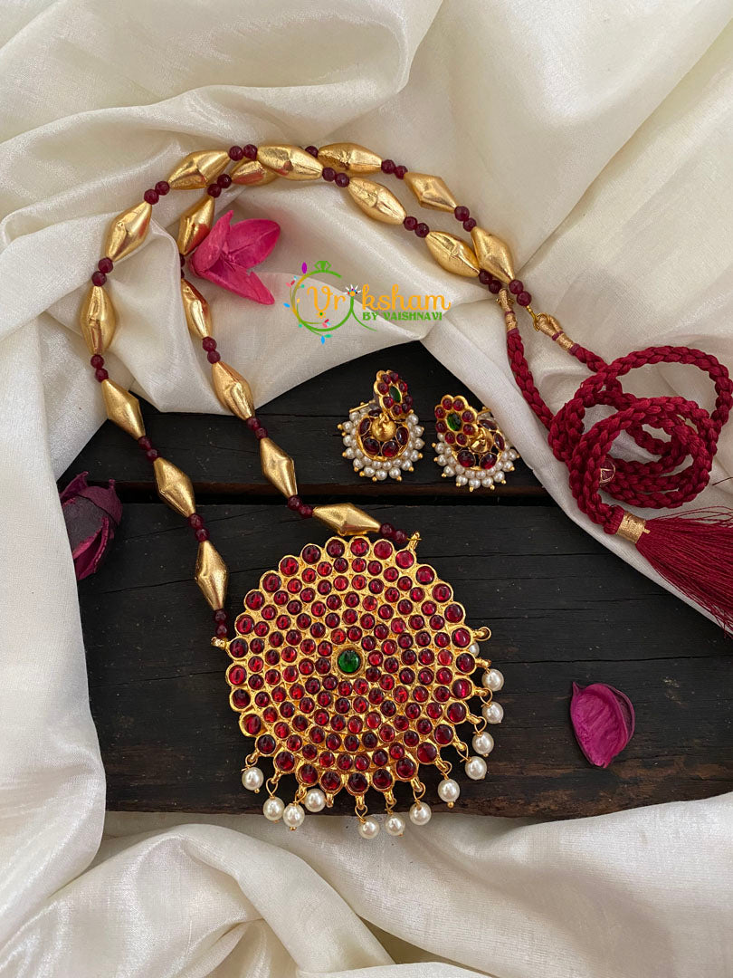 Traditional Red Kemp Chakra Pendant Dolki Bead Neckpiece -Red stone neckpiece. Comes with matching jhumkas.