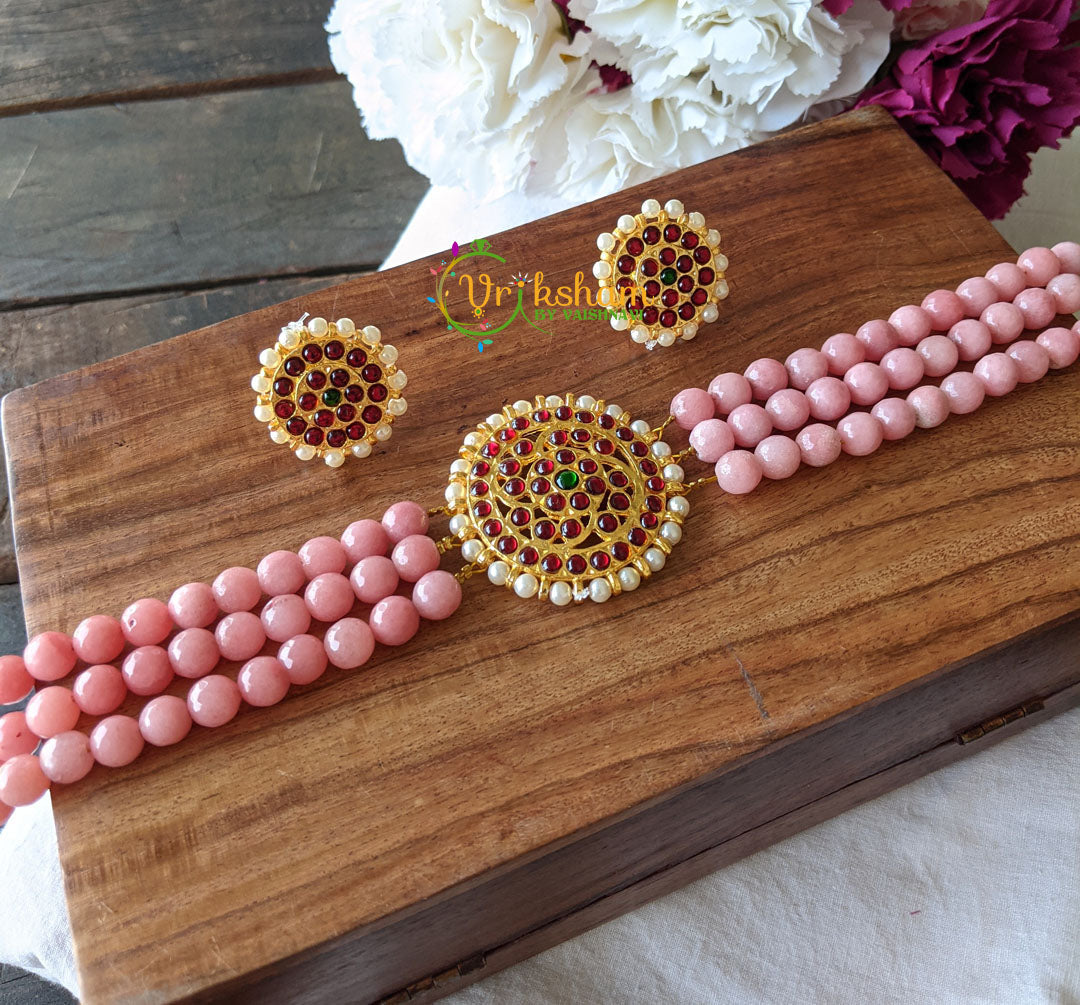 Kemp Chandran High Neck Choker -Light Pink three layer beaded neckpiece. Comes with matching ear studs.