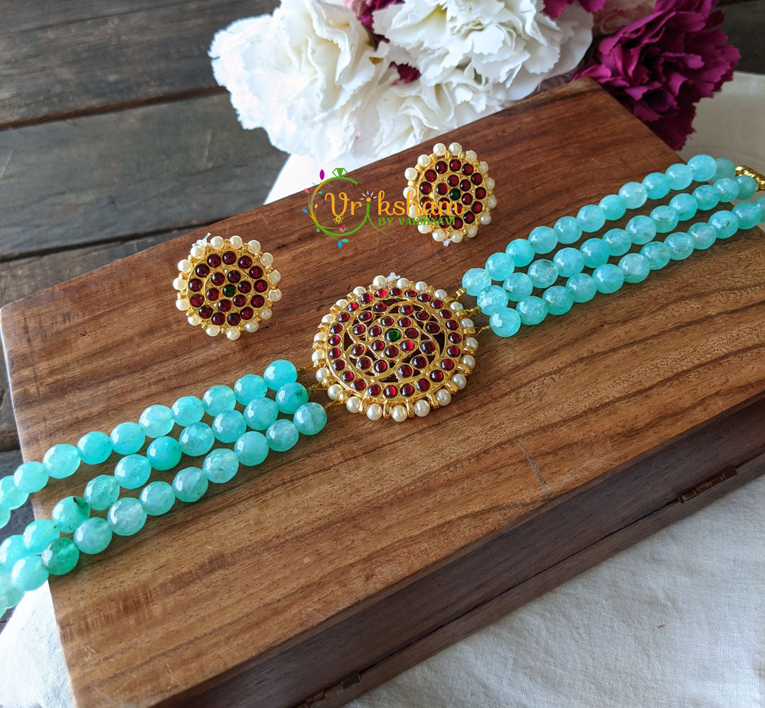 Kemp Chandran High Neck Choker -Aqua Blue three layer beaded neckpiece. Comes with matching ear studs.
