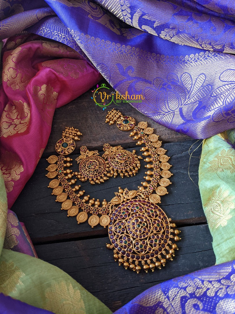 Premium Kemp and Coin Style Matt Choker - with end mogappu and coin along the length of the neckpiece. Comes with matching ear hangings.