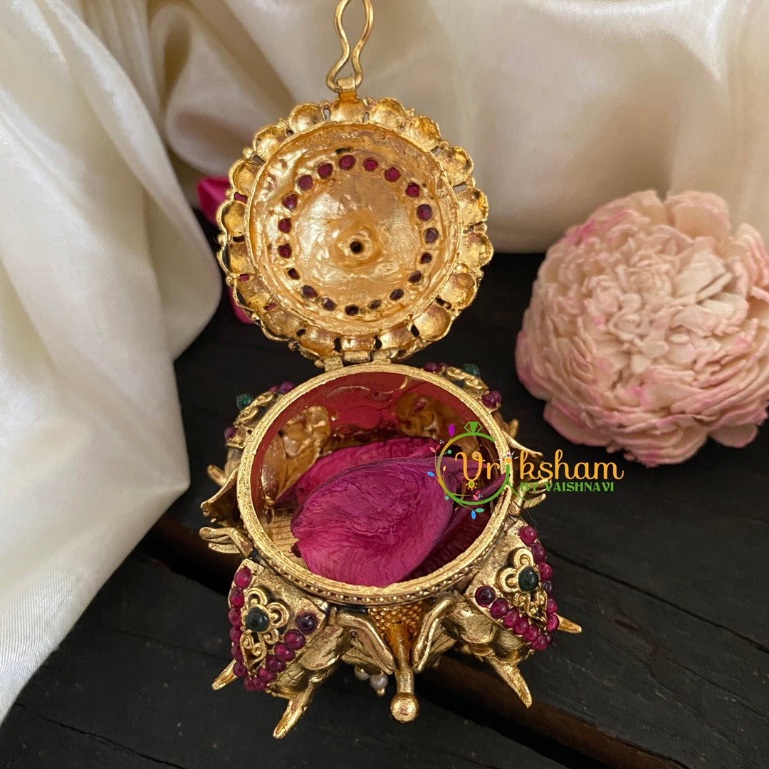 Kemp Elephant Kumkum Box- in a round sort of shaped red and dark stone studded box with a standing out flower on top and elephant faces standing out on the side of the box.