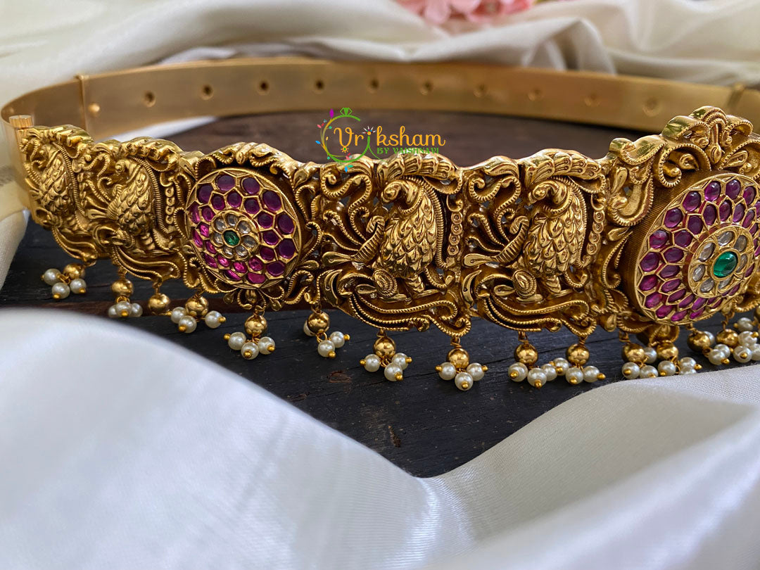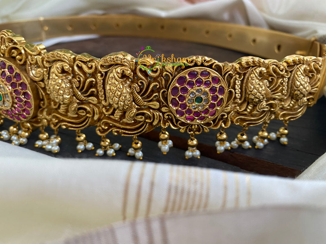 Precious Kemp Hipbelt -No idol hipbelt - with red and green studded peacock patterned bridal hipblet.