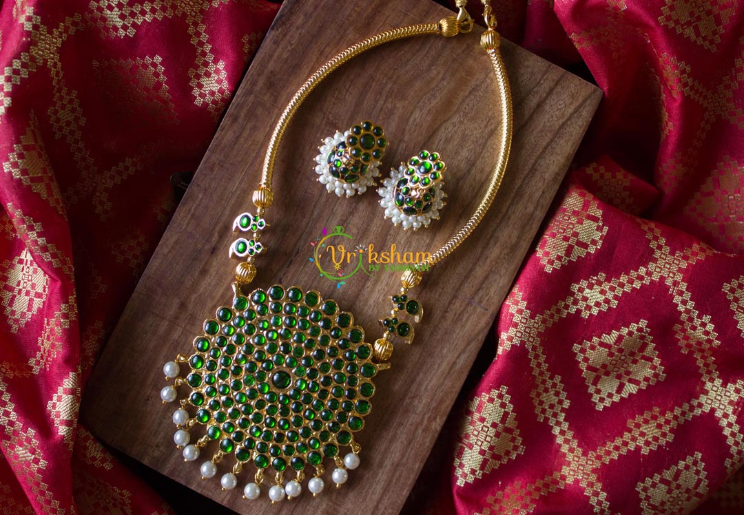 Kemp round pendant Adigai - Green. As already stated any design of Kemp that you require which can be handmade can be done. These are not precious Kemp stones. They are imitation. But they are handmade ?? Vriksham in an effort to support handmade jewelry has ventured into this. Looking forward for all of your support as always.