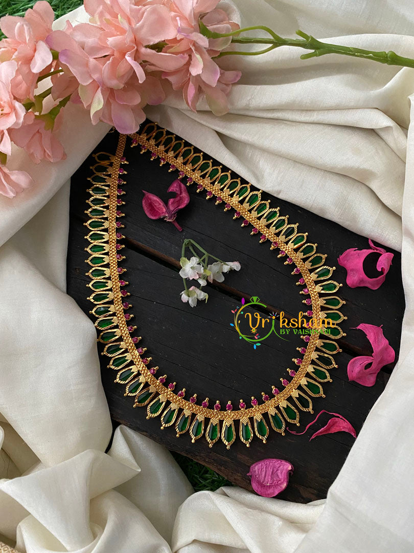 Traditional Kerala Green Palakka Haram-Mid-Length Haram-Traditional Kerala Temple jewelry- Mottu Palakka and ad stone arranged; NECKPIECE ONLY.