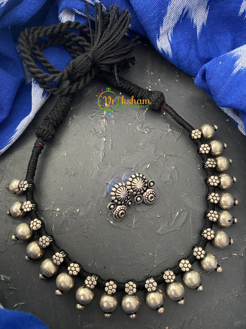 Black Kolhapuri Silver Neckpiece-Sphere ;Handmade; Silver look alike jewelry ;one of a kind short neckpiece with adjustable black back rope/thread.