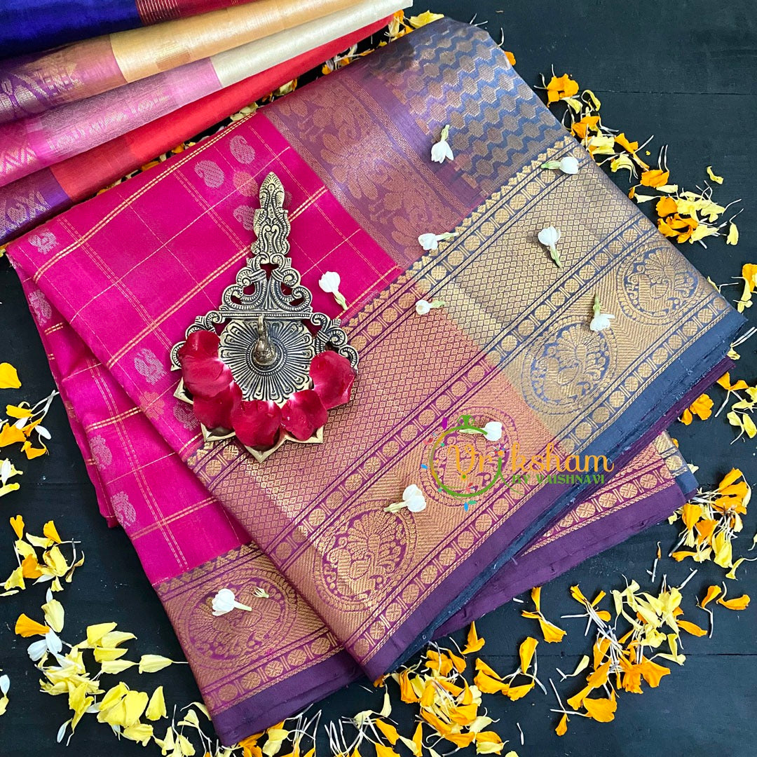 Pink Kattam Korvai Handloom Silk Cotton Saree.- Festive wear saree – Pattern throughout the saree; comes with Blouse attached. Two side contrast border and pallu.