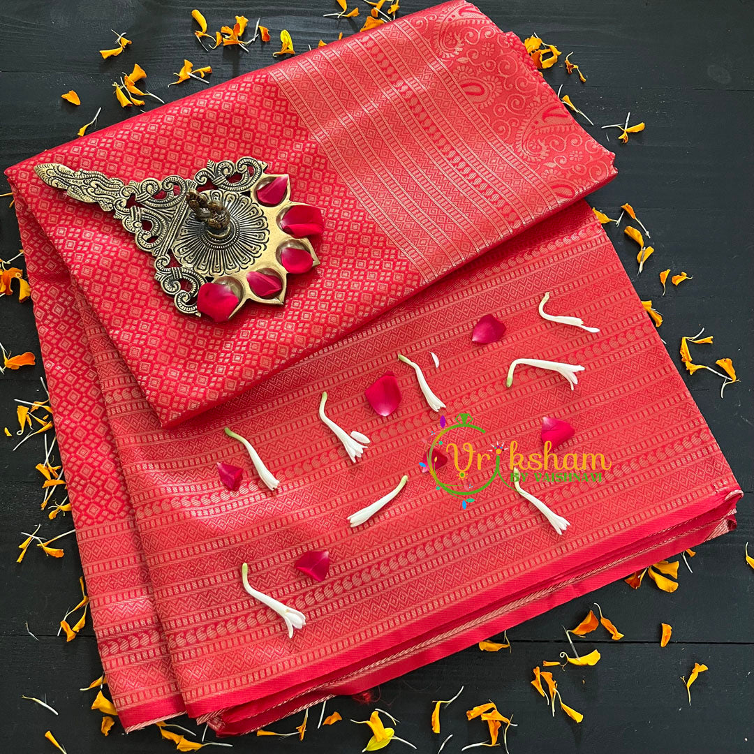 Kumkum Red Silk Saree- Litchi Silk Saree - Festive wear saree – Smaller dice with dot pattern throughout the saree; comes with Blouse attached. One side Big Border and other side lean border. Power loomed saree.