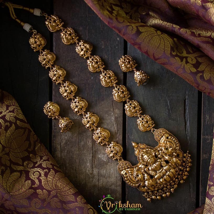 Traditional Lakshmi Haaram with jhumkas is a gold look alike long neckpiece with earrings. This long neckpiece has a big lakshmi pendant.
