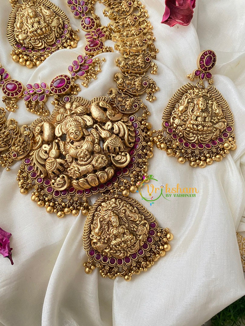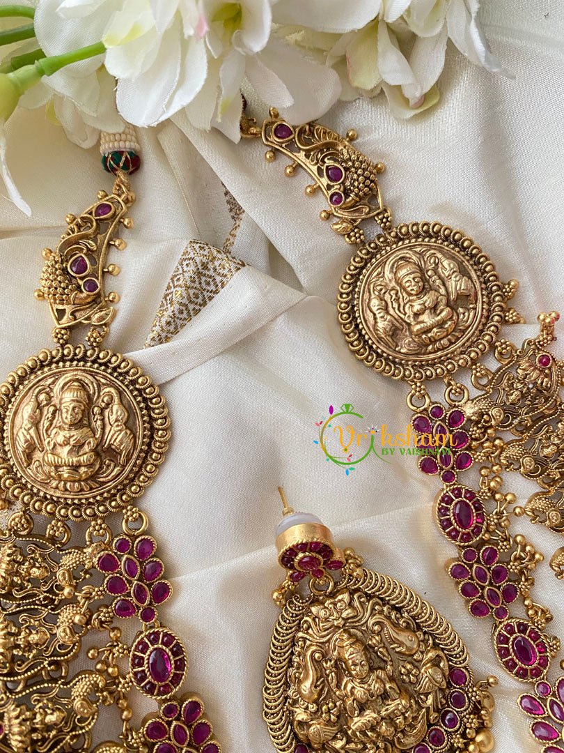 Premium Layered Lakshmi Haram with Mugappu-Red stones and Gold Bead Finish -Intricately Designed Temple Neckpiece, with lakshmi pendants and Mogappu comes with matching ear hangings.