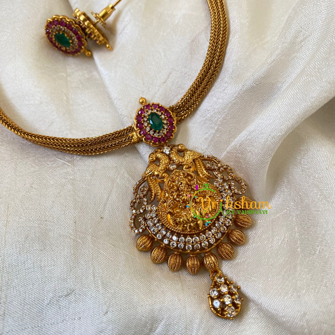 Lakshmi Pendant Short neckpiece - simple temple make neckpiece with Centre Lakshmi Pendant and stone studded peacocks along the length of the neckpiece, comes with matching earrings.