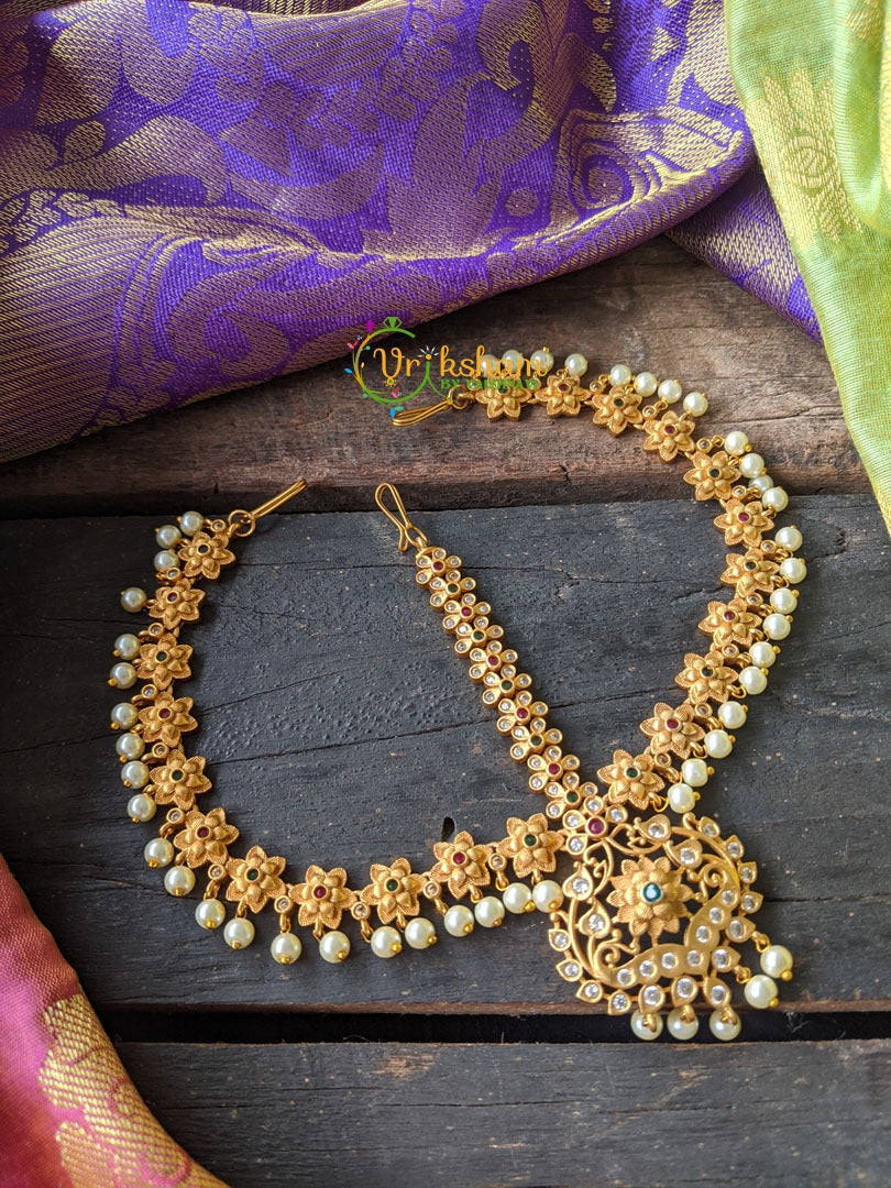 Matt Maang Tikka -Nethichuti -Two side flower patterned, red, white and green CZ stone premium quality Maang tikka/Nethichuti with artificial pearl finish.