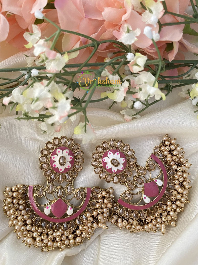 Meenakari Designer Danglers- Pink -Fancy Festive Dangler with imitation kundan stones and cluster pearl finish.Pink and white meenakari enamel painted Party wear dangler.
