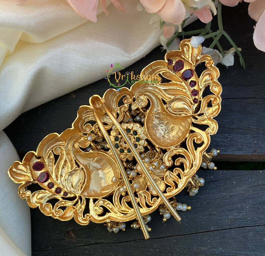 Premium Peacock Jada Billai– Hair Accessory -Peacocks patterned Kemp imitation stone set single piece billai with pearl finish.