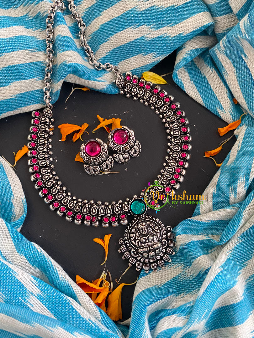 Lakshmi Pendant Kolhapuri Temple Choker- green stone Lakshmi pendant and pink stones short neckpiece, comes with pink studs.