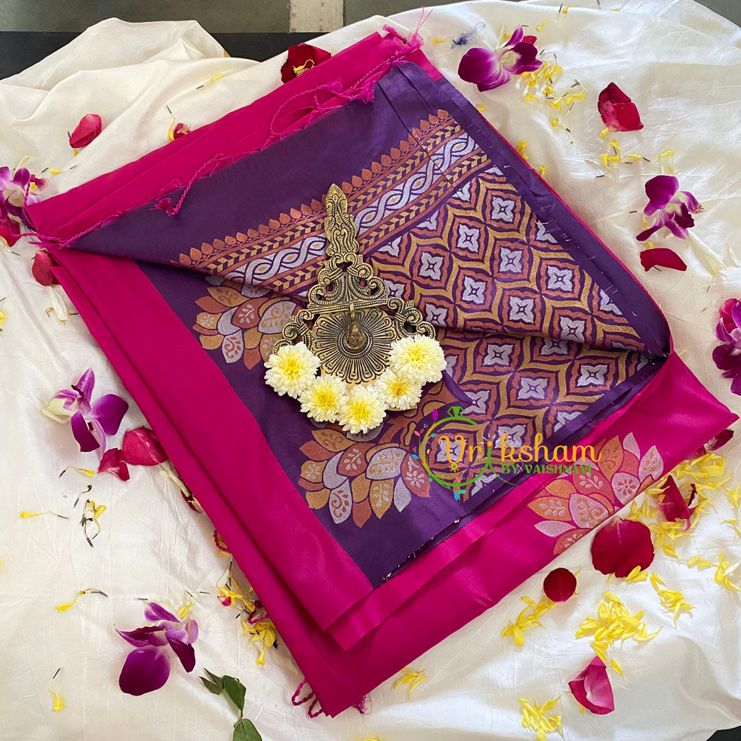 Pink with Purple Soft Silk Saree- Festive wear saree – Pattern throughout the saree; comes with Blouse attached. Borderless saree.