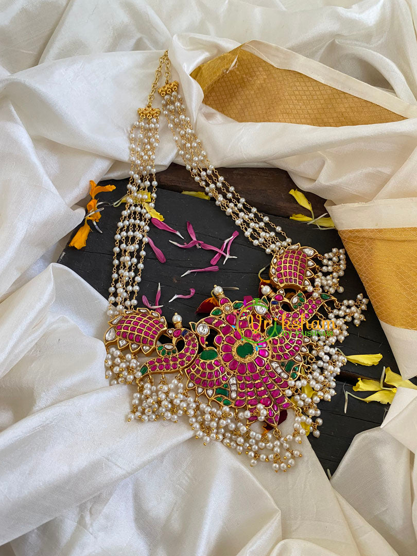 Precious Jadau Kundan Guttapusalu Neckpiece – Premium quality polish precious Pink green and white kundan jadau work; guttapusalu pearl finish.