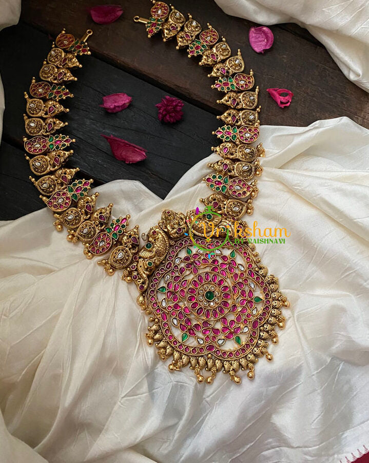 Gold Look Alike Maanga Neckpiece -Precious Kemp Pendant Haram– One gram gold polish -Hand moulded -closed back neckpiece– complete paisley pattern - studded with semi-precious real kemp stones with Floral pendant. NECKPIECE ONLY.
