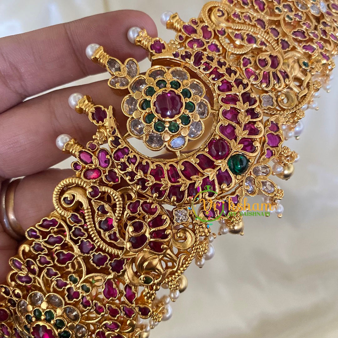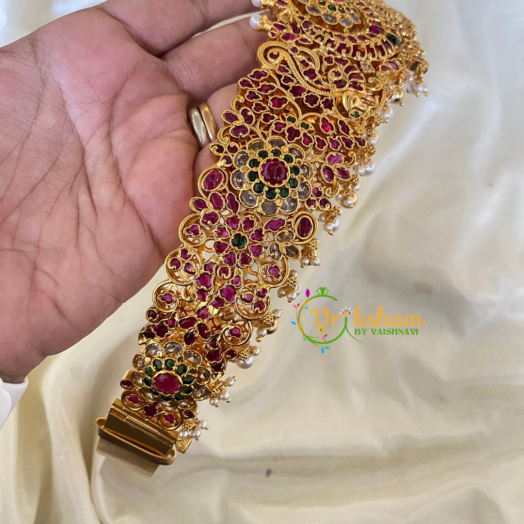 Premium AD Stone Bridal Hipbelt with green and red imitation stone and floral pattern. Pearl finish pattern.