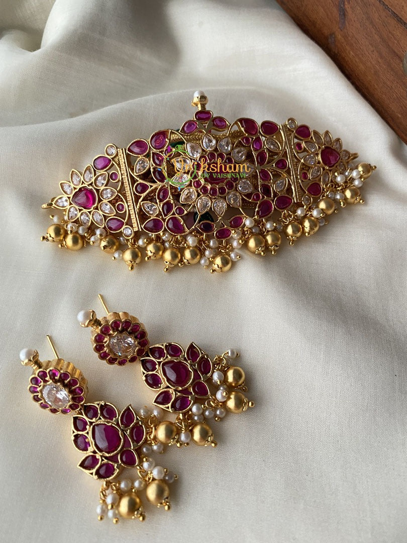 Premium Kemp High neck Choker -Green White Red – Gold look alike, floral pattern stone studded, pearl and Gold bead finish. Comes with a pair of earrings.