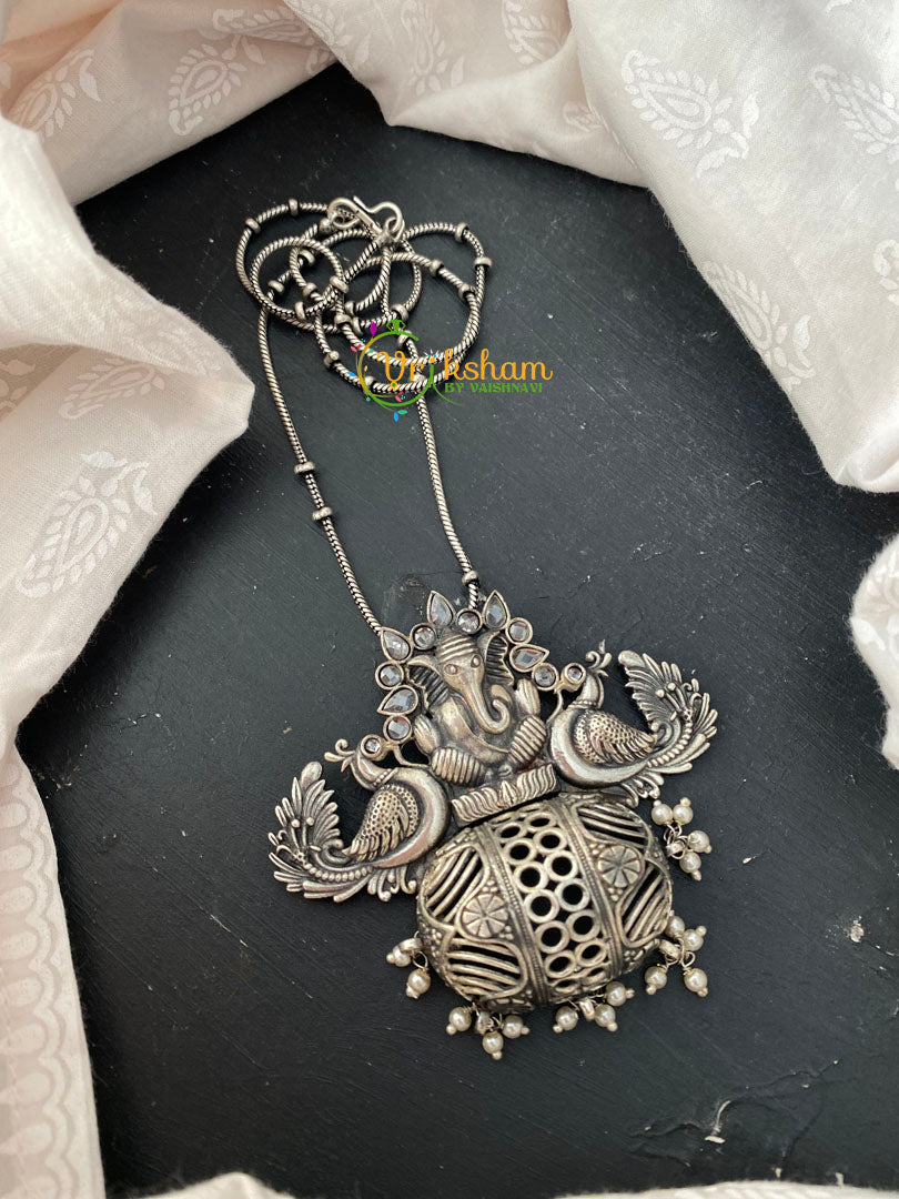Silver Look Alike Pendant Chain - Pendant with peacock and ganesha pendant mid length neckpiece. NECKPIECE ONLY.