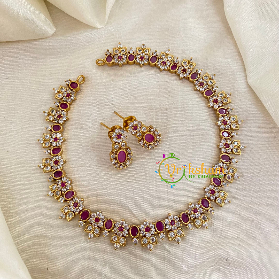 Simple AD Stone Choker Short Neckpiece -white red green AD stone flower patterned choker short neckpiece with earrings.