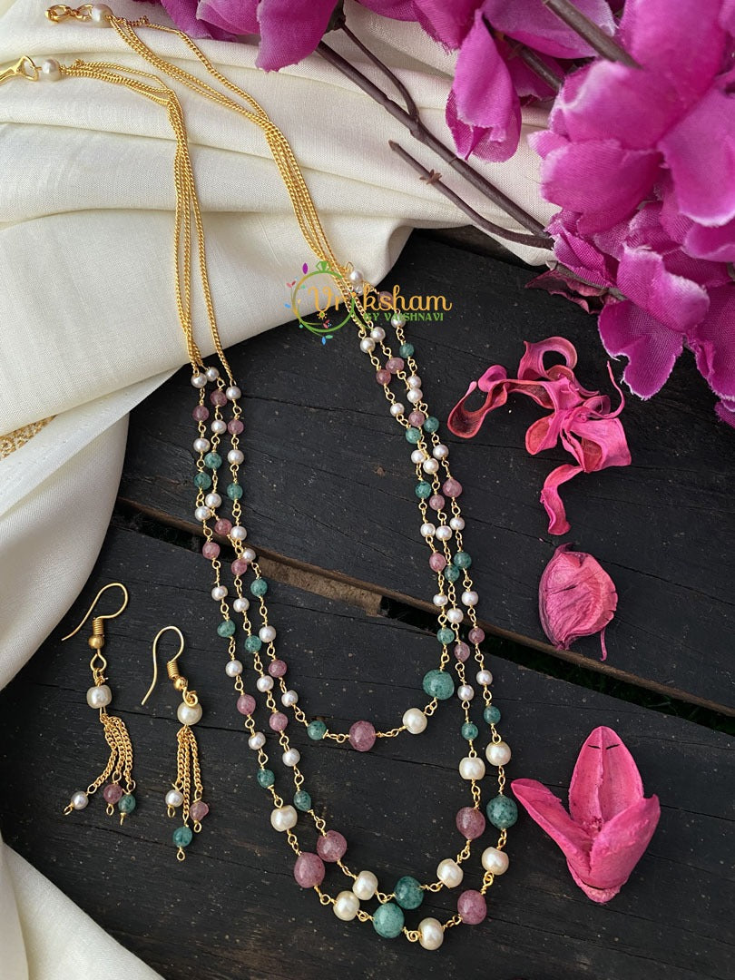 Simple Elegant layered Bead Malai -Green white and red jaded Malai; 3 layers comes with matching Earring.