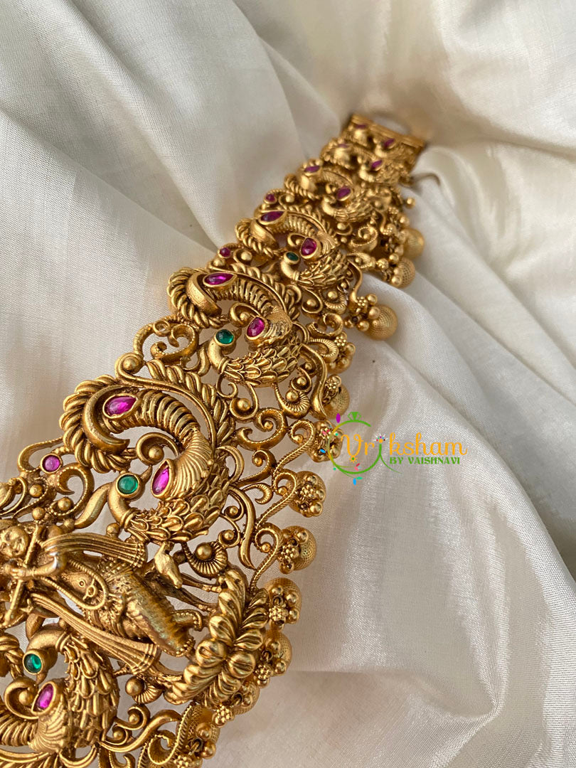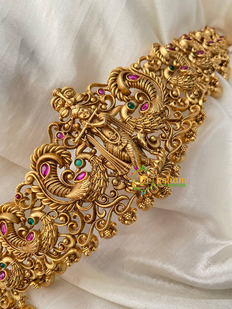 Sri Krishna Hipbelt – Gold Look alike Temple Hipbelt with green and red imitation stone and krishna with flute pattern.