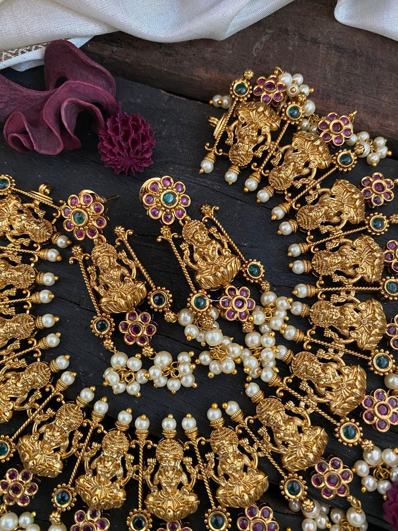 Premium AD Stone Temple Choker – Lakshmi Neckpiece –Red and Green stone studded Lakshmi idols as length of the neckpiece; Comes with pair of Lakshmi stud jhumkas. Cluster Pearl Finish.