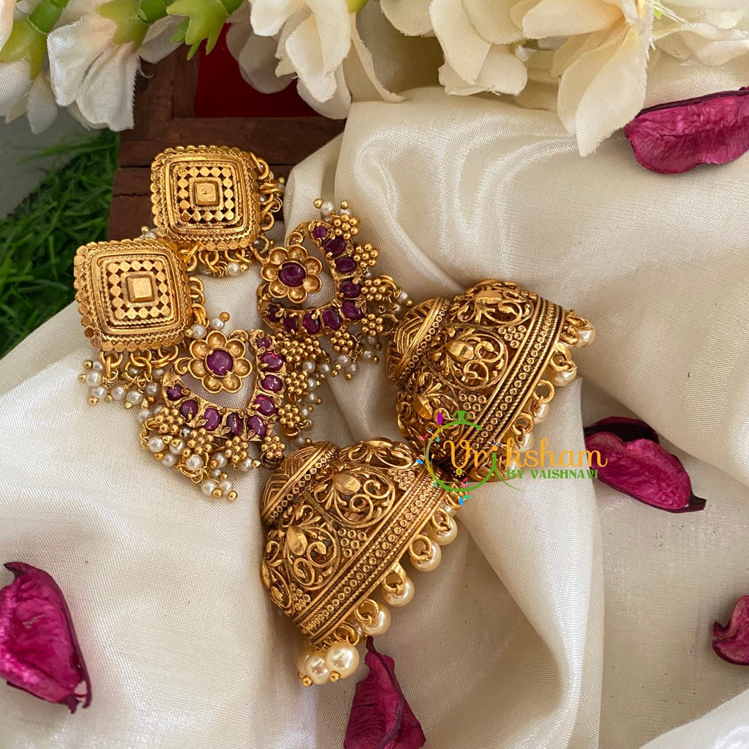Traditional Three Tier Long Jhumkas-Red ad stone studded in heart shape centre piece; top geometrical stud and bottom jhumkas. Pearl Finish.