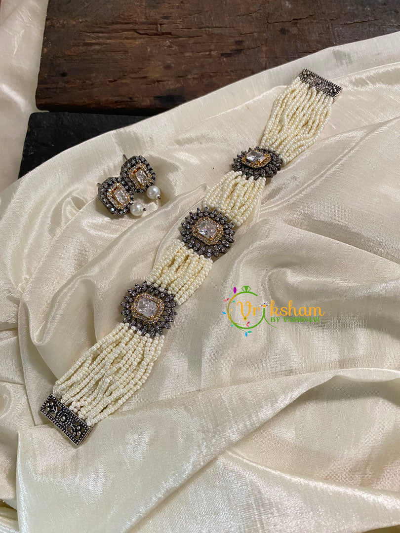 White Bead Victorian Diamond High Neck Choker - precious stone studded neckpiece ; comes with matching earrings.