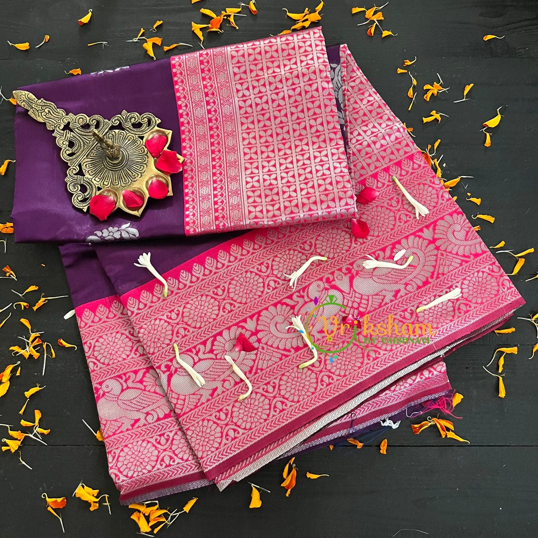 Violet Saree with Pink Border- Litchi Silk Saree - Festive wear saree – Motif pattern throughout the saree; comes with Blouse attached. One side Big Border and other side lean border. Power loomed saree.