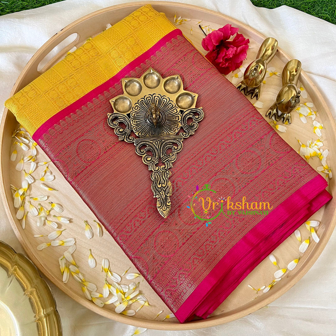 Yellow with Pink Kora Muslin Saree - Festive wear saree –self work throughout the saree; comes with Blouse attached. Two side border and pallu.