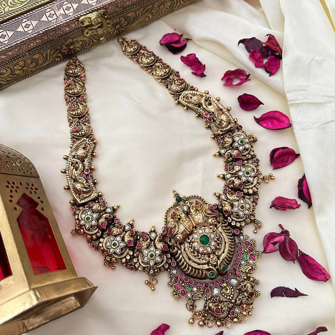 Indulge in the luxury of this exquisite 1 gm Gold Dual Peacock Pendant Haram. Featuring delicately crafted peacock and flower designs adorned with a touch of sparkling ad stone, this haram exudes sophistication and elegance. Make a statement with this exclusive piece, perfect for any occasion.
